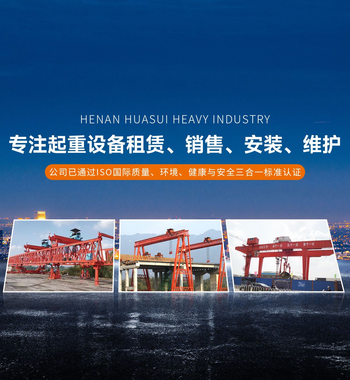 河南華隧重工機械裝備有限公司主要從事通用門式起重機、橋式起重機、電動單梁起重機,輪胎式起重機、架橋機、提梁機、遠梁平車、鋼絲繩電動萌蘆、卷揚機、起重配件制造、銷售:起重機械租賃、安裝和維修,起重設備園收,機械設備維修,鋼結構工程承包,橋梁工程及技術咨淘服務,銷售五金制品、機電設備:建設工程監理,建設工程設計,各類工程建設活動,建筑勞務分包,建筑物折除作業,施工作業,工程管理服務,土石方工程施工,裝如發運。  公司已通過IS0國際質量、環境、健康與安全三合一標準認證,特種設備制造許可證和特種設備安裝改造維修許可證。擁有完熟的質量管理體系。嚴格的管理制度,強大的生產能力和先進的檢測手段,在保證產品質量的同時,也具備了極強的市場競爭力?! 」緢猿挚萍紕撔聻槔砟?,產品質量為核心,注重信譽,建立了減信可靠、快捷、思速。便利周到的售后服務網絡。  我們擁有的技術專家和技術服務隊伍為客戶提供充善的售前技術支持和全天候的售后服務體系,讓您無后顧之憂,享受一站式的超值服務?!  叭A隧重工,伴您成功“是華隧重工永遠的宗指,真被的希望與各界朋友攜手并進。共創輝準!